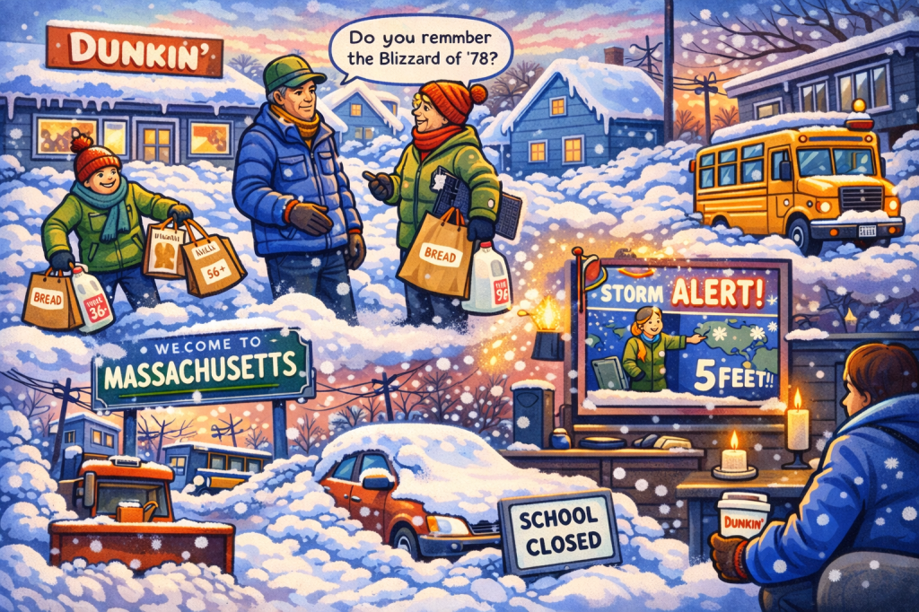A humorous look at the unspoken rituals of a Massachusetts snowstorm—from denial and bread-and-milk panic to Blizzard of ’78 nostalgia and the sacred Dunkin’ run. A blizzard, Massachusetts style.